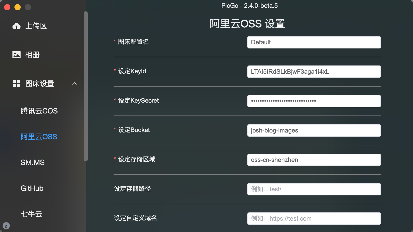 然后分别把刚刚在阿里云中创建的 AssessKey ID和 AssessKey Secret 填入PicGo中的 设定KeyId 和 设定KeySecret 。