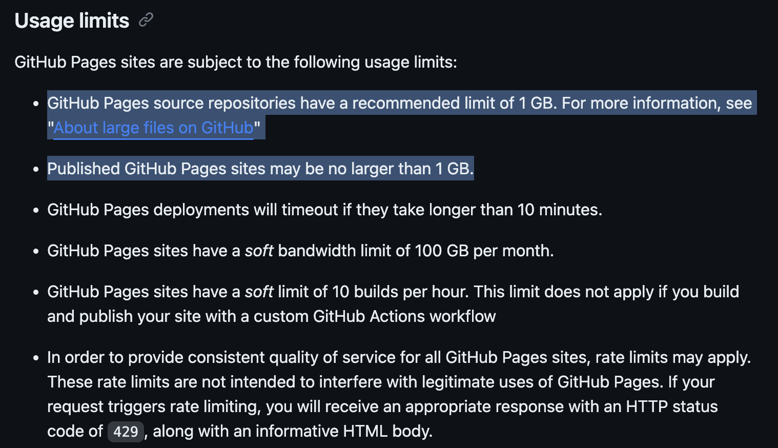 第一种方法是直接将图片存入 Github 的仓库中,这种方法最大的优点就是免费和可靠了,访问的速度也很快。缺点是 Repository 的存储空间不能太大,官方推荐是小于 1GB,如下面我从 Github Docs 中截的图。
