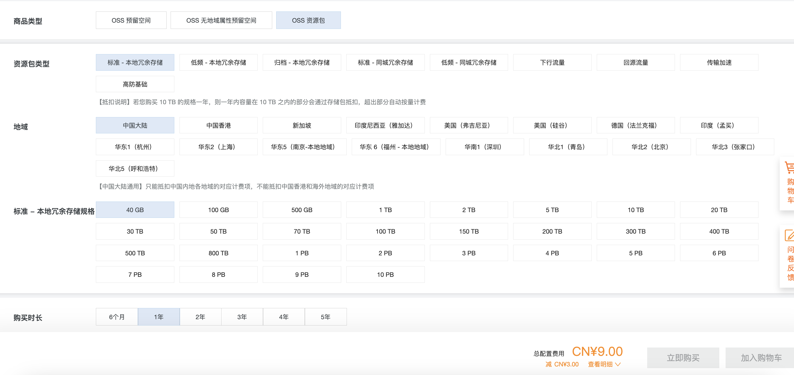 前往 阿里云 OSS官网,点击立即购买。然后按照下图购买方案即可,一年 9 块钱,也不算很贵