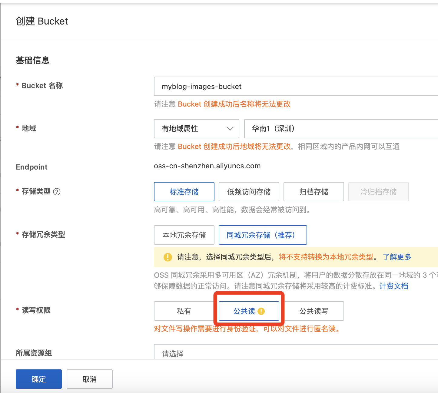 然后 设定Bucket 和 设定存储区域 根据自身情况填,可参考下图,最后按确定即可