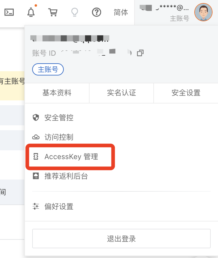 这里需要填入 设定KeyId 和 设定KeySecret,可以在「阿里云 -> 右上角头像 -> AccessKey 管理」中创建 AccessKey。