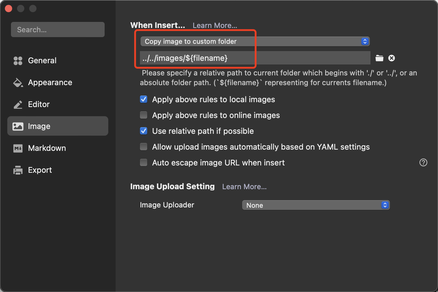 于是我们可以使用 Typora 图片上传的特性完美解决这个痛点。打开 Typora 的 Setting,Image,选择 Copy image to custom folder,意思就是当插入图片的时候会将图片复制到指定的文件夹中,指定的那个文件夹我们用相对路径表示就行,如下图(请务必按照你自己的实际情况来配置)